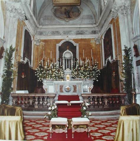 | L'altare riccamente decorato - Si notano alcuni quadri fessurativi nel muro del coro | Il Vestibolo d'ingresso - Si nota ancora il Battistero sulla destra |