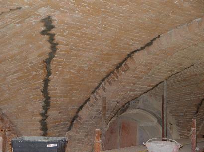 | Dettaglio fessura otturata con TIXO T1 e rete d'acciaio per intonaco consolidante | Alessandro Curti indica il voltino da riparare |