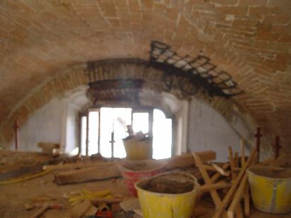 | La modanatura del voltino mirabilmente riparata da Alessandro Curti | La volta centrale intonacata |