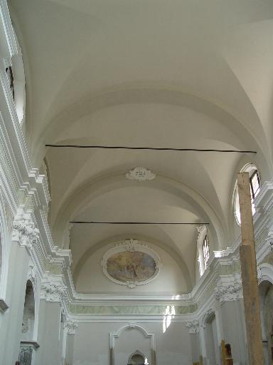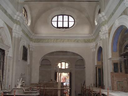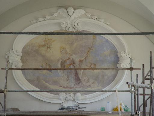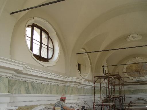 - Navata centrale - : Eliminazione dei ponteggi, restauro modanature, restauro affreschi, tinteggiatura completa