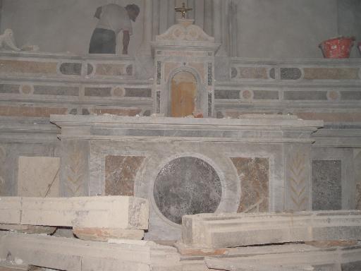 | Navata centrale, vista dall'altare verso il Vestibolo | Particolare dell'antico Altare settecentesco in corso di ripulitura |