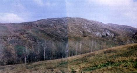 ![]() Panoramica vista da S-SO di un rilievo collinare impostato nei terreni argillosi ed intensamente tettonizzati del complesso caotico AUCT. In particolare si osserva come il versante meridionale di tale rilievo sia interessato da tipiche forme calanchive prodotte dall'erosione diffusa delle acque di ruscellamento superficiale su terreni argillosi che affiorano lungo versanti molto acclivi ed esposti all'insolazione. |