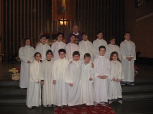 Anche quest'anno immancabile sono stati gli appuntamenti liturgici riservati al gruppo ministranti che ha accolto nella sua comunità 8 nuovi servitori all’altare. Infatti domenica 24 dicembre e domenica 7 gennaio, nella nostra parrocchia si sono svolte le cerimonie di vestizione di questi 8 nuovi fanciulli. Nicolò, Pietro, Nicola, Riccardo, Lisa, Francesca e Chiara nell’ultima domenica di Avvento hanno avuto l’onore di vestire la veste benedetta e di servire all’altare già il giorno del Natale del Signore. Francesco invece colpito da un attacco influenzale ha dovuto rimandare al 7 gennaio, giorno del Battesimo di Gesù, la sua prima messa servita molto onore. Dopo mesi di preparazione e incontri, con prove, preghiere e approfondimenti su chi è il ministrante e il suo ruolo all’altare, il parroco con il responsabile ha tenuto opportune le cerimonie allargando per l’ennesima volta l’armata bianca del Signore. Ora il gruppo di ormai 18 ragazzi, si incontrerà periodicamente con cadenza bisettimanale, al sabato pomeriggio per approfondire temi liturgici in preparazione alla Quaresima e alla Pasqua del Signore. |