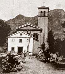 Particolare tratto da una fotografia del 1906 (F. Zanier Editore - Udine). Si notano i lavori di costruzione della nuova chiesa di Pielungo. Di particolare interesse il fatto che il nuovo edificio sia posto immediatamente a ridosso di quello vecchio, inglobando il preesistente campanile.
