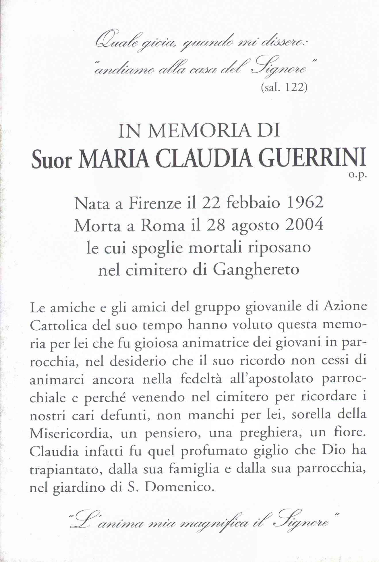 Una delle ultime volte che vidi Claudia le feci presente di alcune situazioni difficili e lei mi rispose: “Cresceremo, cresceremo…”, con quella serenità di chi è consapevole che Dio da’ a tutti la possibilità di camminare e di crescere. Claudia amava molto stare con la gente, amava il dialogo, l’ascolto ma non l’ho mai sentita perdersi in pettegolezzi.