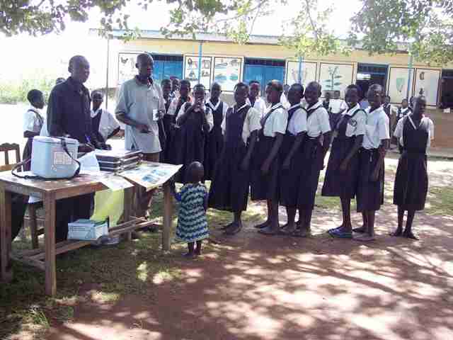 In una delle scuole nella parrocchia di Lodonga, tutti i ragazzi si mettono in fila per ricevere la