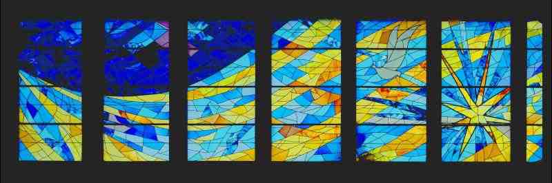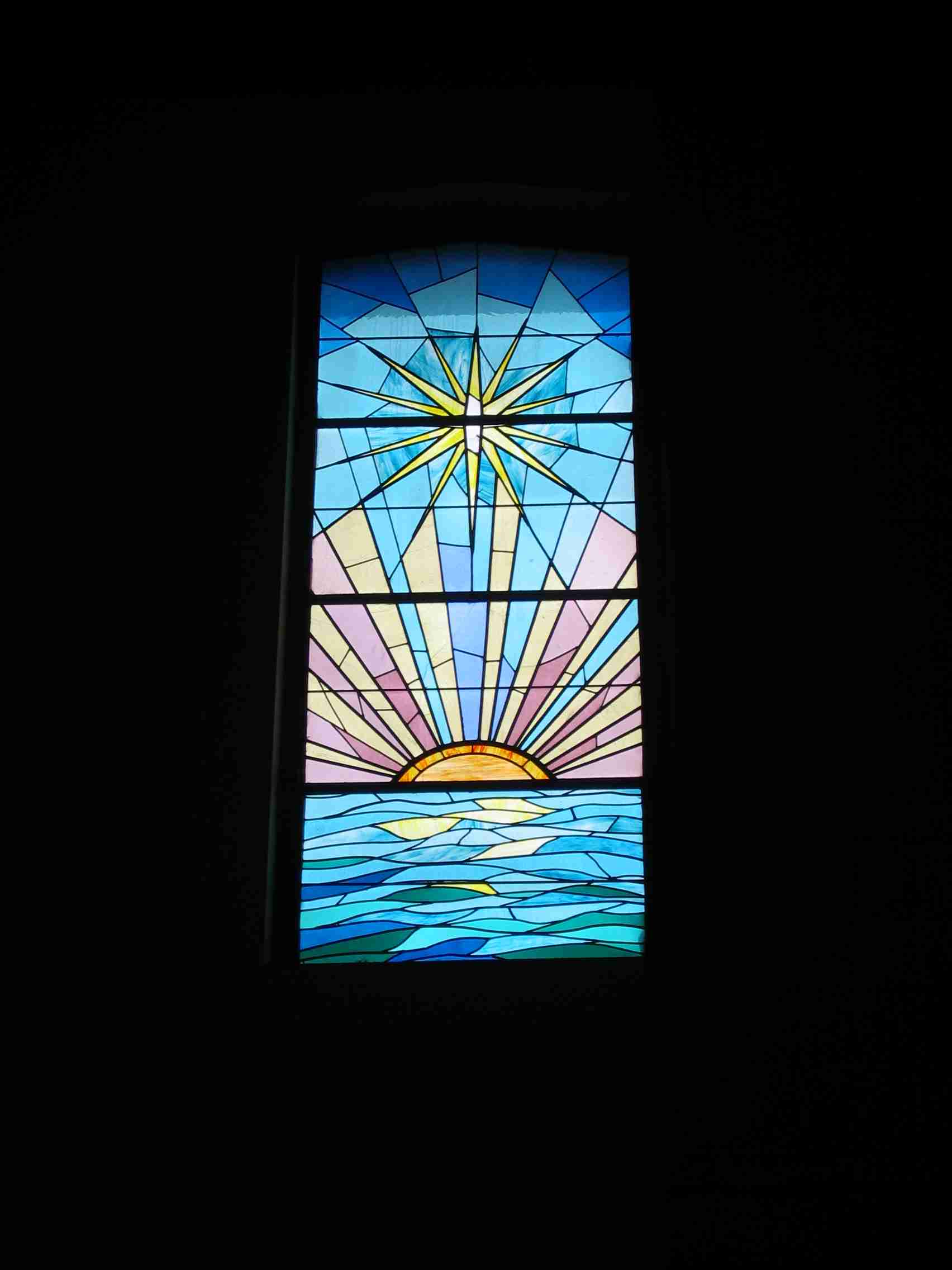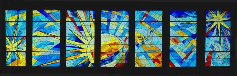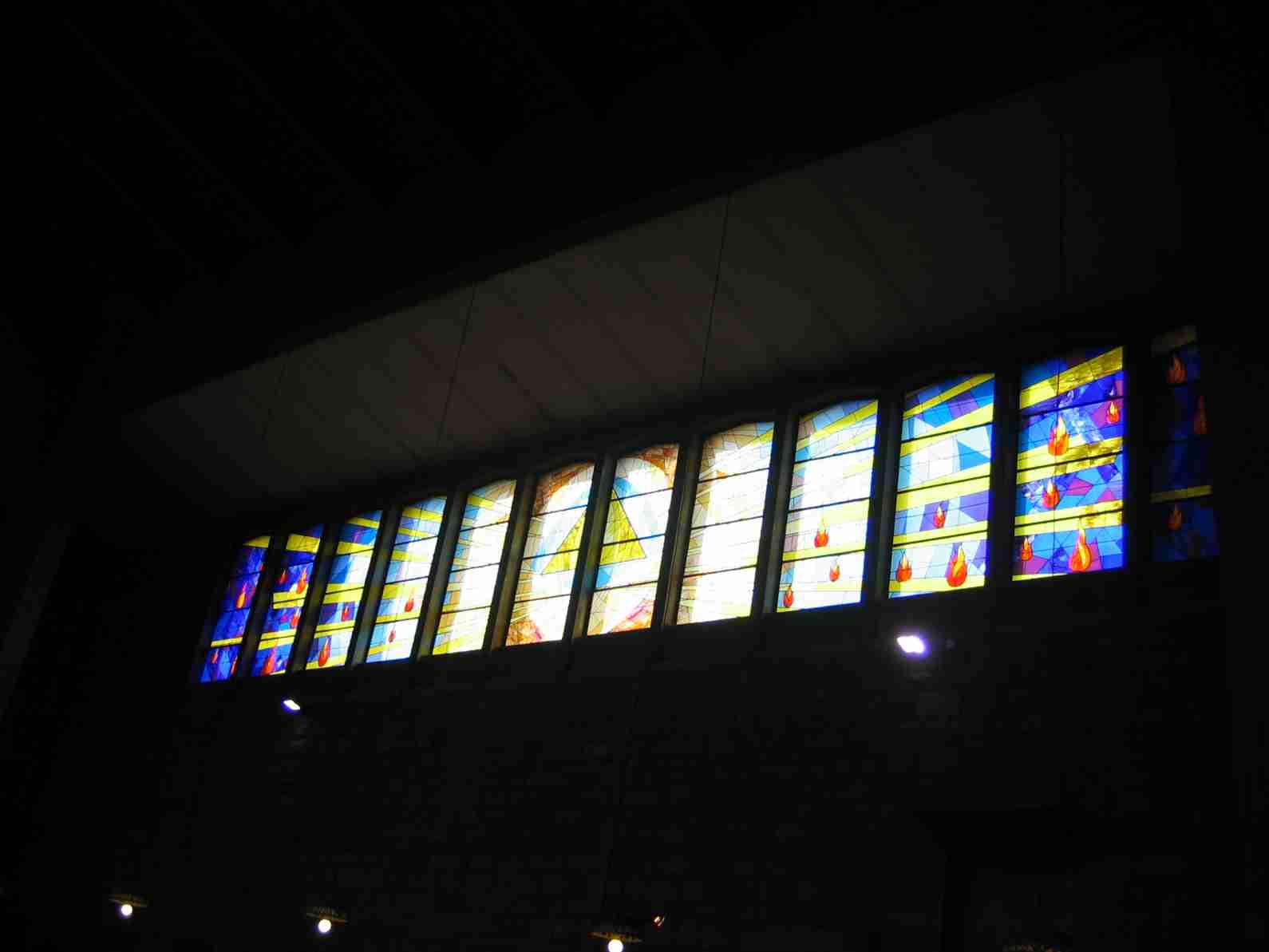 La vetrata di sinistra rappresenta la Pentecoste cristiana: dalla luce