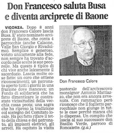 Dopo 24 anni, a settembre 2005 la comunità di Baone ha salutato il proprio parroco, don Silvano Guzzonato e ha accolto il nuovo arciprete, don Francesco Calore.