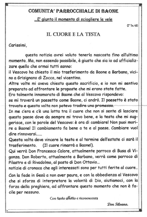 - La risposta del Vescovo alla comunità. - L'articolo tratto dal Mattino di Padova su don Francesco.