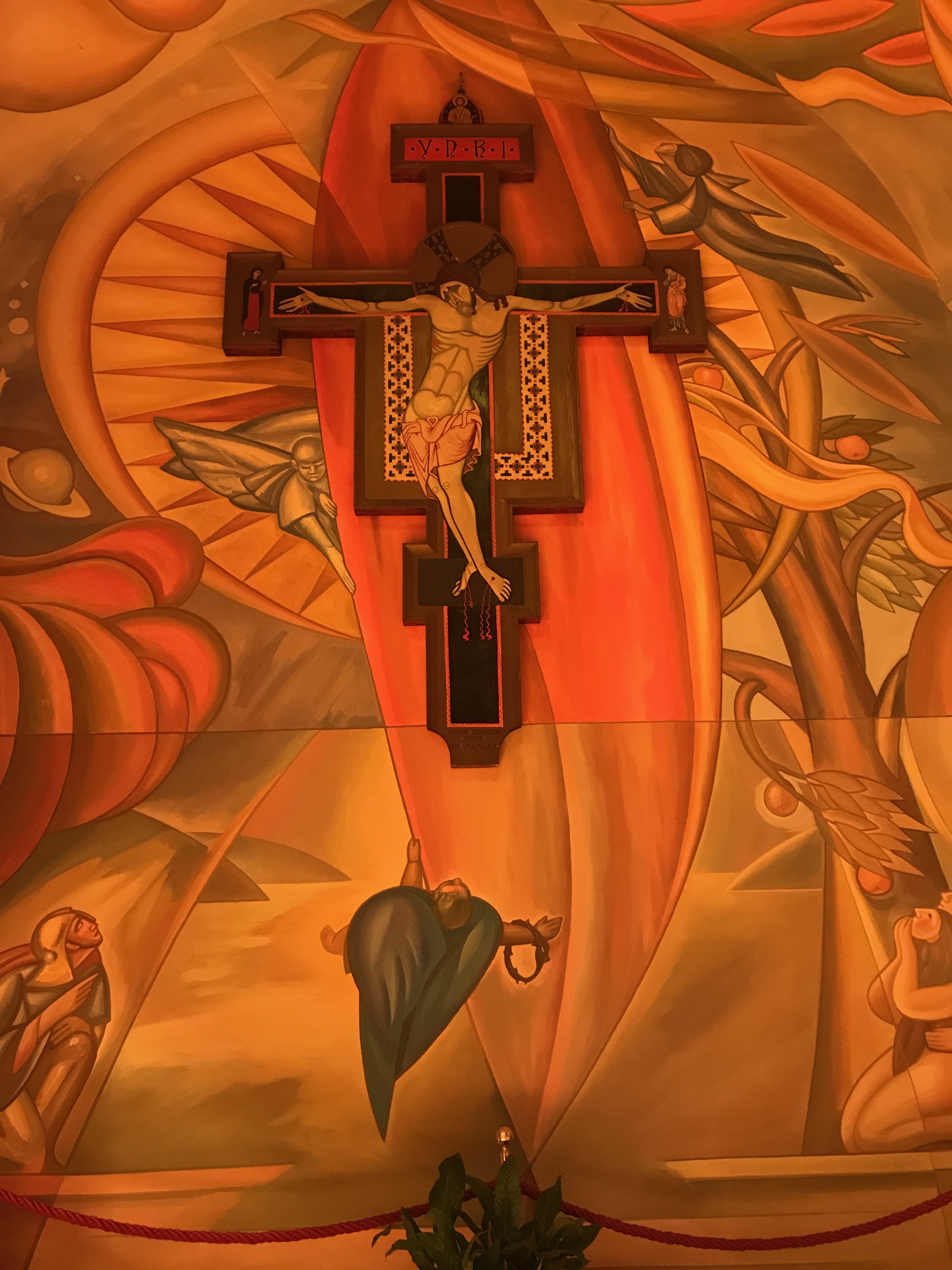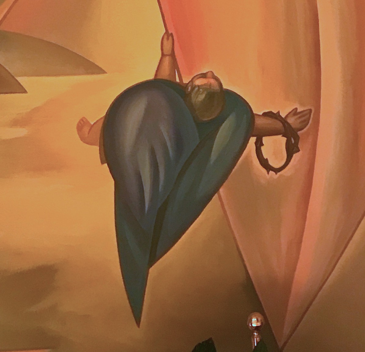 Attorno alla figura del Cristo ruotano diversi angeli che giungono da ogni parte del firmamento a sorreggere la croce. Uno di questi arriva (dalla parte bassa) e porta con sé una corona di spine.