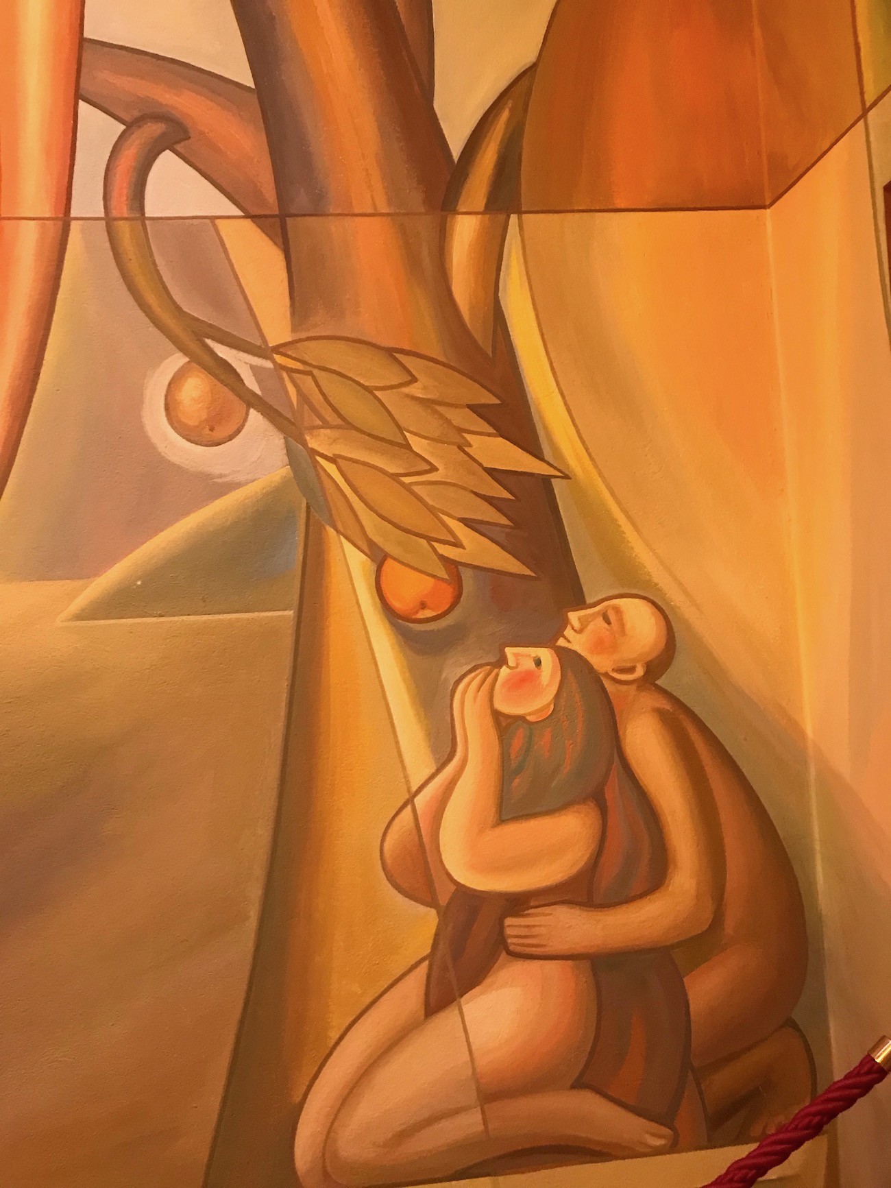 Nella parte destra della cappella si vede l'episodio della Genesi di Adamo ed Eva che si accostano al frutto proibito. Questa è stata la causa della lontananza dell'uomo con Dio, e la corce di Gesù ne rappresenta la riconciliazione.
