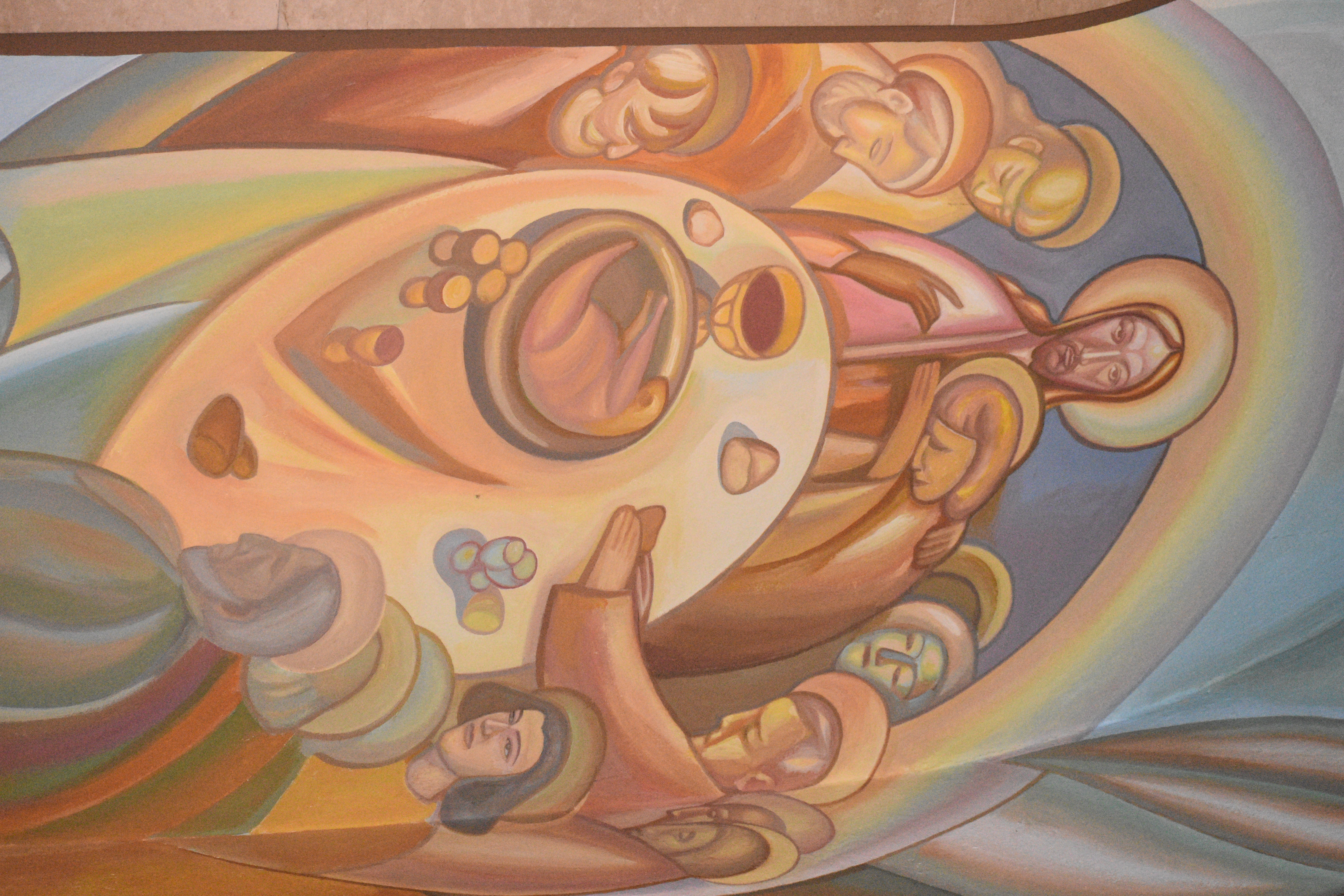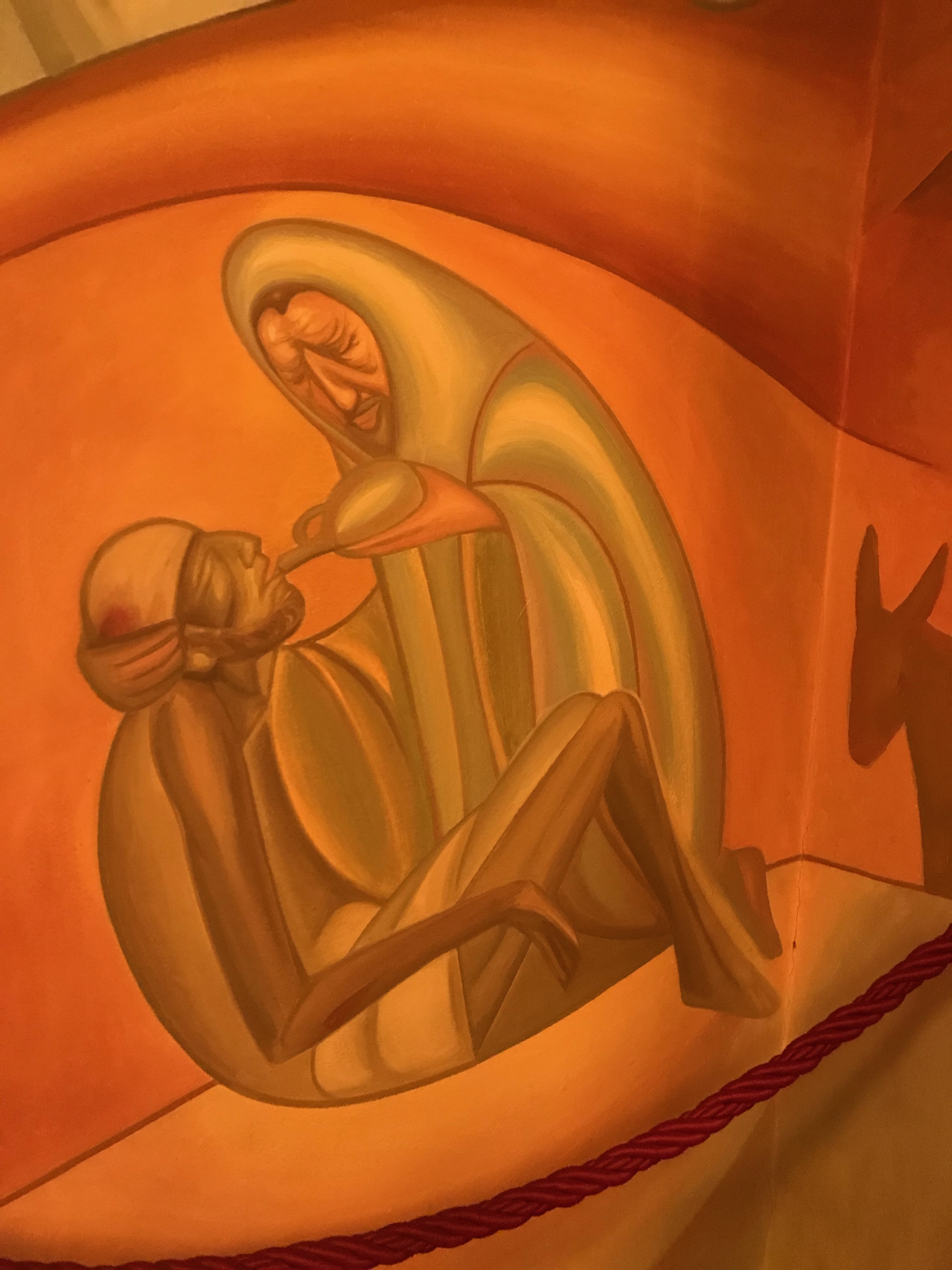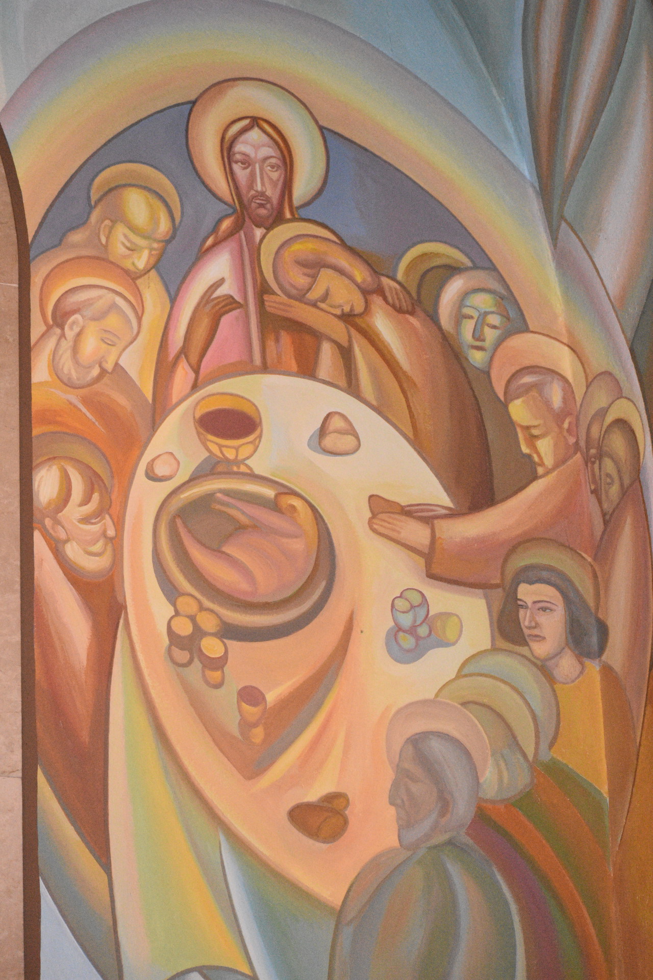 - a destra quella del Buon Samaritano (Lc 10, 25-37), possiamo vedere il samaritano che si prende cura del sofferente. C'è un volto che lega l'ultima cena e la parabola del buon samaritano: quello di Santa Madre Teresa di Calcutta, figura importante dell'ultimo secolo che può essere considerata come figura della misericordia umana e del buon samaritano