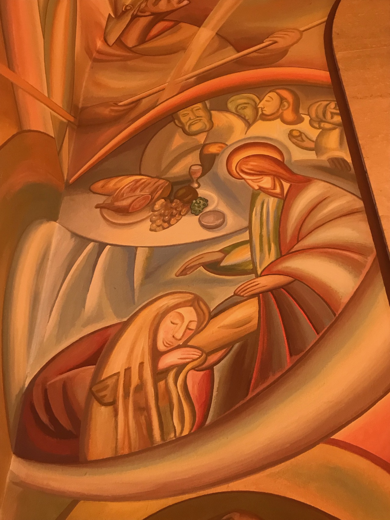- a sinistra l'episodio con la peccatrice che si accosta ai piedi di Gesù e lui che con grande misericordia le dice "Donna, ti sono perdonati i tuoi peccati" (Lc 7, 36-50)