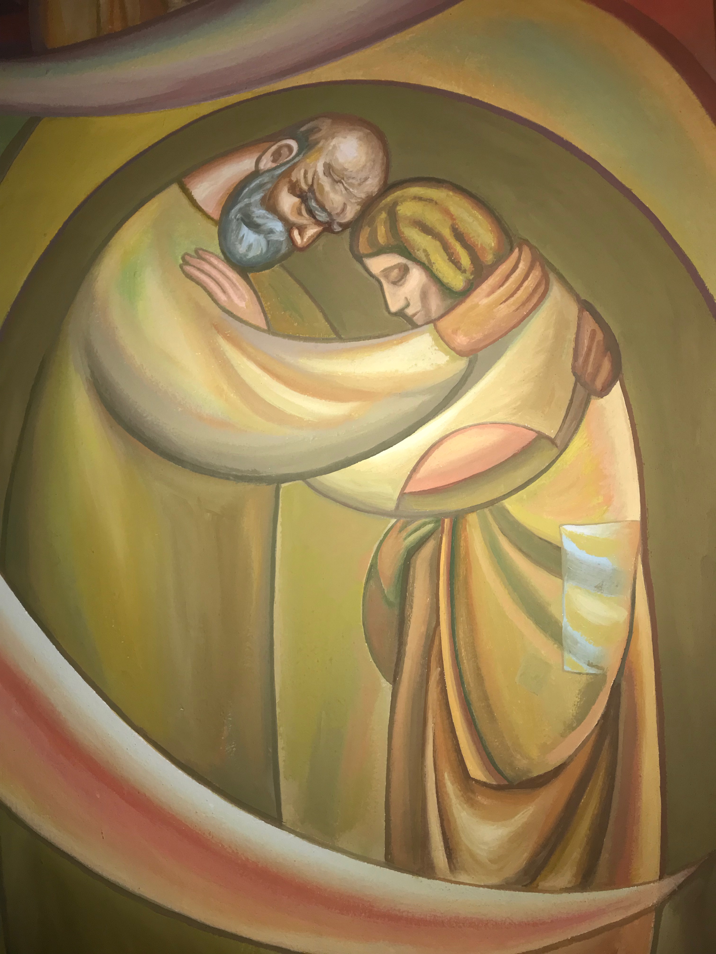 - a sinistra quella del Padre Misericordioso (Lc 15, 11-32), c'è un grande abbraccio tra il padre che ha misericordia verso il figlio pentito che torna a casa e il figlio stesso