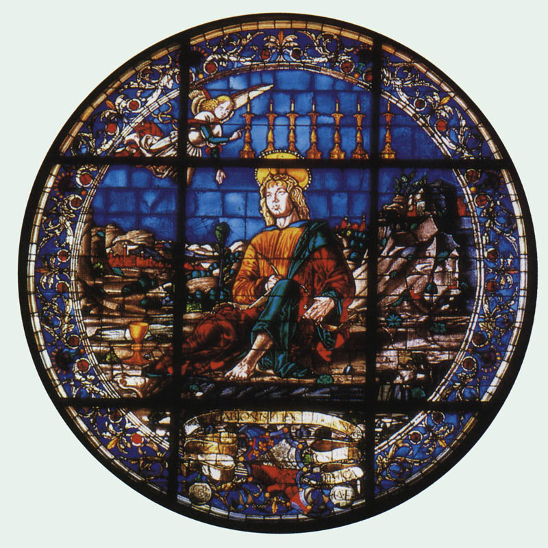 VETRATE di notevole pregio sono visibili nella facciata, in particolare quella circolare raffigurante S. Giovanni Evangelista nell'isola di Patmos, eseguita dai vetrai bolognesi fratelli Cabrini su disegno di Lorenzo Costa o Francesco del Cossa; a quest'ultimo si attribuisce senz'altro un'altra vetrata presente rappresentante la Madonna seduta in trono.