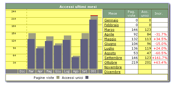 S. Eufemia, Novembre 2002 Quando ci si incontra in parrocchia capita di parlare di indirizzi e-mail, Internet e del Sito, ma non si ha la visione completa di quante persone possano utilizzare tutto questo. Grazie ad un programma gratuito (ShinyStat Free - http://www.shinystat.it/ -) abbiamo iniziato a conteggiare le visite del nostro sito dal mese di Marzo 2001 e con sorpresa ci siamo accorti che le nostre aspettative sono state superate. Di seguito vi esponiamo in un grafico i dati raccolti. Il nostro GRAZIE a tutti i visitatori!
