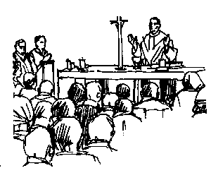 l'orecchio attento e con l'occhio rivolto al celebrante che sta spiegando i