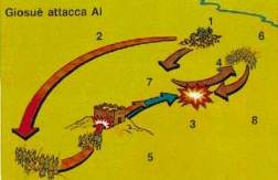 1. Giosuè si accampa. 2. Giosuè tende un’imboscata a ovest della città. 3. Gli uomini di Ai avanzano nella valle contro gli israeliti. 4. Le forse principali di Giosuè si ritirano. 5. Gli uomini dell’imboscata entrano in città e l’incendiano. 6. Giosuè vede il fuoco e dà il segnale di contrattaccare. 7 Gli uomini dell’imboscata avanzano. 8. le truppe di Ai accerchiate e sconfitte. |