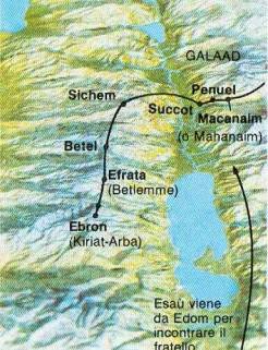 Giacobbe. Giacobbe, nipote di Abramo, dopo aver defraudato del diritto di primogenitura il fratello Esau, si rifugiò presso parenti a Paddan-Aram, la regione circostante Carran. Ivi lavorò per vent'anni al servizio dello scaltro zio Labano, quindi prese le due mogli, i loro figli, le proprie greggi e mandrie e se ne tornò in patria. Aveva ancora molla paura dell'ira di Esaù e a Macanaim invocò disperatamente l'aiuto di Dio. Dio lo rassicurò, e l'incontro col fratello fu un incontro pacifico. Passò il resto della vita in Canaan, finché vecchio raggiunse Giuseppe in Egitto, |