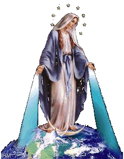 vide la Madonna in piedi sul mondo, con le dita delle mani emananti fasci di