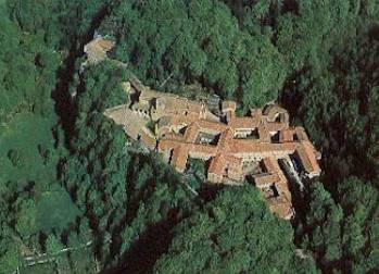 Veduta aerea del complesso conventuale incastonato nei boschi