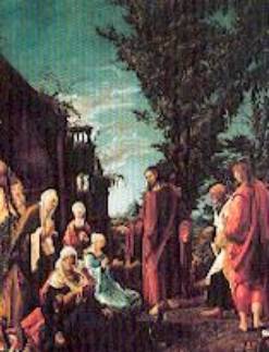 Cristo che si congeda dalla madre, di Albrect Altodorfer. Venuto per Gesù il tempo di iniziare la vita pubblica, egli lasciò la sua casa di Nazaret. Il pittore raffigura il dolore della madre che presagisce la fine violenta di suo figlio. Il tema è tratto dai racconti apocrifi. |