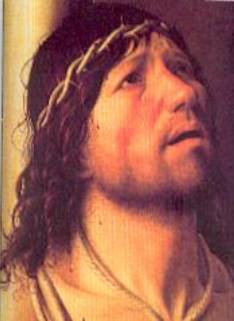 Cristo alla colonna, di Antonello da Messina. Il pittore, con una descrizione quasi maniacale dei particolari, raffigura il dolore di Gesù, coronato di spine, legato come un malfattore e abbandonato da tutti; la bocca semiaperta è al tempo stesso una domanda al Padre ed una accettazione della sua volontà. |