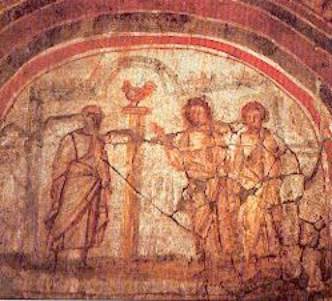 Il rinnegamento di Pietro, affresco della catacomba di Commodilla. La scena è una di quelle preferite del ciclo di Pietro, sia nelle pitture catacombali, sia sui primi sarcofagi cristiani. |