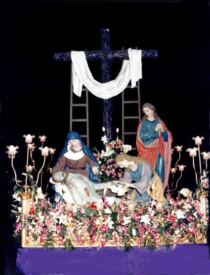 | Descrizione: La composizione ricorda la Pietà del Michelangelo. Gesù deposto dalla croce è posto sulle ginocchia della Madre. A sinistra lo sconsolatissimo Giovanni impietrito dall’intenso dolore, mentre Maria Maddalena in una effusione di riverita tenerezza prende fra le sue mani quelle del Cristo. Dietro al centro, la croce da cui pende la Sindone apprestata da Giuseppe d’Arimatea nel momento della deposizione. |