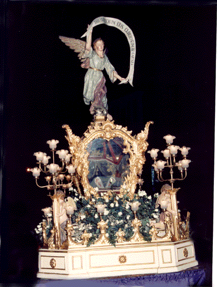 | Descrizione: Il Cristo morto, ispirato a Quello della cappella San Severo a Napoli dello scultore G.Sammartino, č dentro un’urna intagliata e ricoperta di oro zecchino. L’urna č sormontata da un Angelo che regge un nastro bianco con la scritta: “Erit Sepulcrum Eius Gloriosum”, poggiata su quattro zampe di leone, č formata da cornici trapezoidali ricchi di intagli quali teste di Serafini, foglie, fiori e frutta, ed č chiusa da quattro cristalli di Boemia. Ai quattro angoli si trovano quattro puttini, veli, velluti e cuscini ricamati adornano il letto su cui giace il Cristo. |