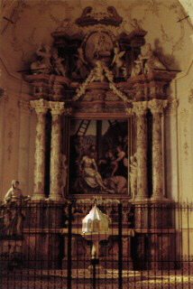 Sullo sfondo la tela che rappresenta la Deposizione.Al centro, il Fonte Battesimale sormontato dal tempietto con cupolino di bronzo dorato.