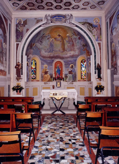 Gli affreschi dell'abside raffigurano l'Incoronazione della Vergine e i quattro evangelisti. Al centro dell'arco la dedica del titolo e ai lati i profeti Isaia e Daniele.