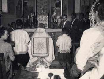 Don Paolo Pifferi allora parroco di Dozza celebra la santa messa all'altare da lui donato. A quell'epoca il sacerdote celebrava dando le spalle ai fedeli.