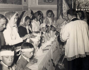 Il vescovo di Imola di allora, S. E. Benigno Carraro, assistito da Don Armando Bettuzzi, benedice i bambini.