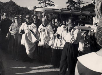 Un momento della processione: al centro sono visibili Don Paolo Pifferi, allora parroco di Dozza, Don Aldo Poggi e altri sacerdoti. I portantindi della venerata immagine della Madonna sono Vittorio Cristiani e Umberto Poggi, i quali sono stati i mastri muratori artefici della chiesa. |