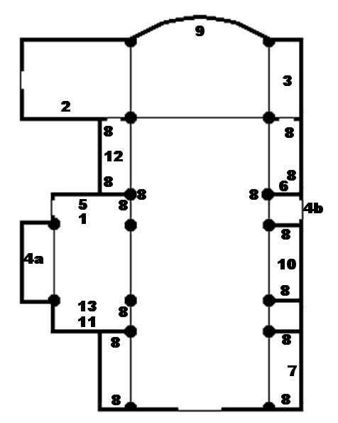La mappa mostra la posizione dei dipinti all'interno della Chiesa Parrocchiale. I dipinti sono numerati in ordine cronologico. Puoi aprire la scheda di ciascun dipinto selezionandola dal menu a sinistra oppure puoi scaricare il libretto completo in formato stampabile.