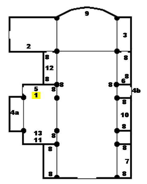 Questa è l'immagine più antica della Chiesa. È stata realizzata con la tecnica dell'affresco, ma in origine non si trovava su questa parete; infatti, la cappella fu costruita solo nel XVII secolo. L'affresco si trovava in origine in un piccolo oratorio vicino alla chiesa di cui ora non rimane traccia. In questo oratorio erano soliti ritrovarsi i membri della Confraternita della Madonna del Rosario. Quando questi decisero di far realizzare prima una tela, poi una cappella dedicati alla Vergine del Rosario trasferirono nella nuova cappella anche l'antica immagine affrescata a cui erano legati.