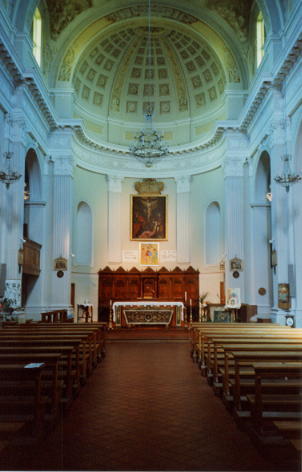 triangolare. Entrando colpisce l'armoniosità dello spazio dell'unica ed ampia navata: le decorazioni a cassettoni del soffitto a botte, il sontuoso cornicione sorretto da una fila di modiglioni, gli stucchi del fascione e degli eleganti capitelli sorretti da colonne scanalate e