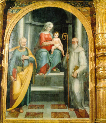 Nel '500 la tecnica espressiva è l'affresco. Vuoto rimase per lungo tempo lo spazio sopra l'altare maggiore come si desume dalla visita di Costantino Bonelli, che nel 1568 decretò di provvederlo di qualche pittura o tavola. Forse però null'altro appare se non l'immagine del crocifisso. Ad occidente si ammira ancora l'affresco avente per soggetto la parola di Dio. Sotto questo affresco vi era stato messo, per un periodo di tempo, un altare minore. Vi era inoltre, anche un altare ad oriente parallelo a quello occidentale. Anche dietro di esso vi era un affresco con quattro figure di santi. Si suppone che davanti ad esso, oltre l'altare vi fosse la statua della Madonna, di cui altrimenti la chiesa sarebbe stata sprovvista. Nel '600 tale devozione sarà sostituita e così scomparirà l'immagine. Nella FOTO6 l'affresco in sfondo all'altare minore occidentale. San Paolo è circondato dai quattro evangelisti che si presentano ognuno col proprio simbolo a lato ( il toro,l'aquila,l'angelo e il leone) tutti rivolti verso l'altare maggiore. Nella FOTO7 l'affresco in sfondo all'altare minore orientale. Riconosciamo: Santa Caterina d'Alessandria, protettrice della sapienza. Sant'Antonio abate che si riconosce dal bastone e dal porcellino. San Sebastiano con le frecce e protettore degli appestati. Per ultimo San Benedetto. In secondo piano Sono rappresentati Santa Caterina e San Sebastiano i due martiri. Nella FOTO8 è visibile un particolare dell'affresco orientale. Come vediamo non tutto l'affresco è sopravvissuto.