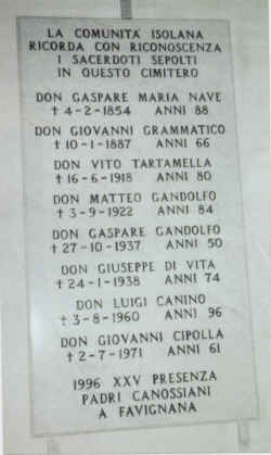 Tra le varie iniziative intraprese in occasione del venticinquesimo anno di presenza dei Padri Canossiani a Favignana una merita particolare segnalazione per la pietà cristiana e per l'umana riconoscenza che essa rappresenta: la collocazione di una lapide nella Chiesa del cimitero dell'isola a ricordo di tutti i Sacerdoti che hanno prestato il loco servizio apostolico a Favignana e che sono stati sepolti in quel cimitero.