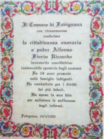 Al termine della messa, un breve trattenimento durante il quale il Signor Sindaco di Favignana a nome della Giunta e di tutta la gente delle tre isole: Favignana, Levanzo e Marettimo, ha data la cittadinanza onoraria a P. Alfonso per quanto di bene egli ha compiuto nel campo sociale e religioso nelle isole nei suoi 28 anni di servizio sacerdotale canossiano.