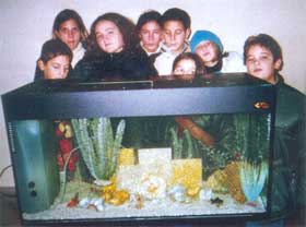 in un acquario in cui il bue e l'asinello sono sostituiti da due