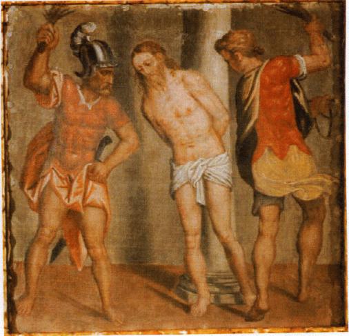 Secondo mistero Doloroso Gesù è flagellato La scena della flagellazione non ha l'aggressività violenta che si riscontra nella coronazione: qui il ritmo è più sciolto e dinamico e i personaggi dei flagellatori nel loro abbigliamento, consentono al pittore di proporre i cromatismi cangianti propri delle nuove correnti pittoriche manieristiche. |