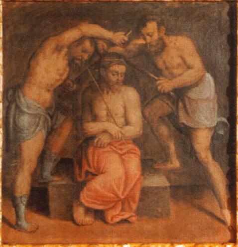Terzo mistero Doloroso: Gesù è coronato All'atteggiamento mite e paziente di Gesù è contrapposta, in questa piccola scena, la forza brutale degli sgherri che incoronano Gesù con la corona di spine fatta violentemente aderire alla testa. Il Mombello riprende qui, interpretando con piglio narrativo popolaresco la proposta di quel plasticismo inaugurato dal Moretto a partire dalle opere monumentali realizzate dopo il 1540.