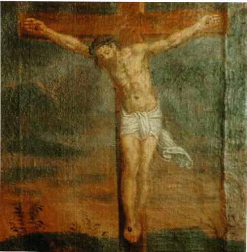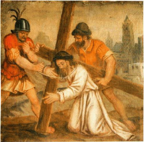 Quarto mistero Doloroso: Il viaggio di Gesù La scena composta con buona resa prospettica aperta su un panorama urbano di una improbabile Gerusalemme. La figura prostrata di Gesù caduto, campeggia al centro illuminato dall'ampia veste bianca, mentre anche lo sgherro dall'elmo piumato sembra adeguare il proprio atteggiamento a quello mite del Cireneo.