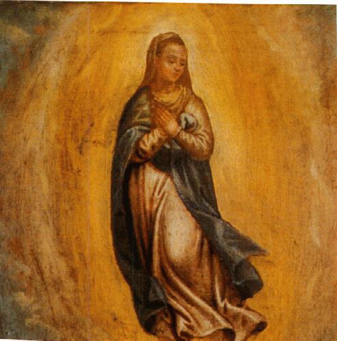 Quarto mistero Glorioso: Maria Assunta L'essenzialità narrativa si rivela nell'unica solitaria figura di Maria Assunta in cielo entro un caldo nimbo luminoso. Un leggero svolazzare delle vesti, derivato da originali invenzioni del Moretto, in armonia con la vividezza luministica suggerisce e sottolinea il dinamismo dell'evento misterioso che si sta realizzando. |
