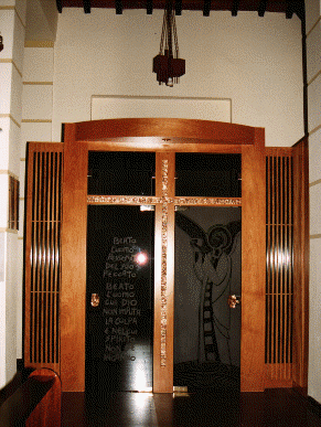 composta da grandi vetrate, disegnate ad intagli, con figure: