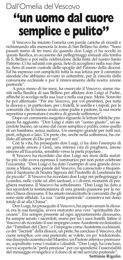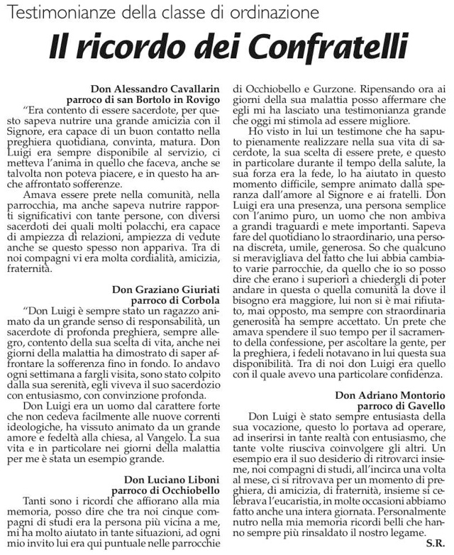 L´8 gennaio era ritornato all´ospedale di Trecenta e da quel giorno molte persone di San Bellino e tantissimi altri amici delle parrocchie dove aveva svolto il servizio sacerdotale si erano attivati nel servizio di assistenza continua, a dimostrazione dell´affetto nei suoi confronti, assieme ai fratelli Tiziano, Carlo, Maddalena, Annarosa e Rita. Nel settembre 2006 aveva radunato vicino tutti i suoi parenti e amici (circa 250 persone ) in una giornata fraterna che Lui da anni organizzava ¨...perchè non si disperdessero le radici...¨. Le sue ultime parole sono state pronunciate domenica sera e sono state un saluto per il suo amico mons. Bruno Segala: «che stia bene e che resti sempre un bravo Sacerdote». I funerali avranno luogo nella basilica di San Bellino alla presenza del vescovo Lucio Soravito domani alle 15,30 e la salma sarà tumulata, per volontà dello stesso don Luigi nel cimitero del paese. Questa sera alle 21 si terrà una veglia di preghiera a suo ricordo. Il sindaco Bordin ha decretato il lutto cittadino.