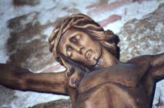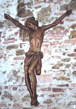 | Il Crocefisso, dono di don Luciano Musi in segno del legame alla nostra Parrocchia in cui ha operato per ben 12 anni come vice-parroco, è un esempio tipico della scultura lignea della tradizione del nord d'Italia. Il volto esprime sofferenza e, allo stesso tempo, l'accettazione di essa. La sofferenza fino alla morte è stata infatti liberamente accettata per amore degli uomini: |
