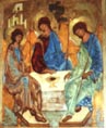L'icona della Trinità è stata realizzata da Mario Piaggi, componente della nostra comunità. E' compito dell'iconografia esprimere in sintesi attraverso l'immagine il contenuto teologico e spirituale della Rivelazione. Questo capolavoro è della scuola russa di Rublev. Il significato del quadro rimanda all'episodio narrato nel cap.18 del libro della Genesi. Tre uomini che poi saranno riconosciuti come tre angeli, vengono ospitati da Abramo ed essi gli annunciano la prossima nascita di Isacco. Nella rilettura dell'episodio la fede ha visto nei tre angeli la presenza della Trinità e nell'ospitalità di Abramo il segno anticipatore della liturgia eucaristica. L'icona lega così la presenza trinitaria alla celebrazione dell'eucarestia. |